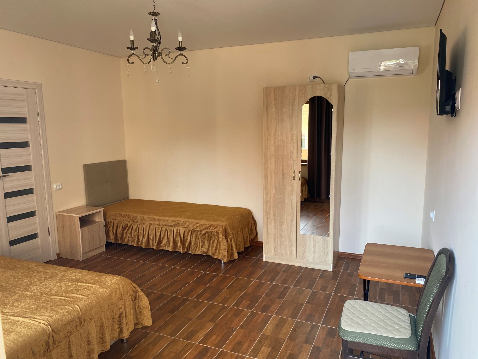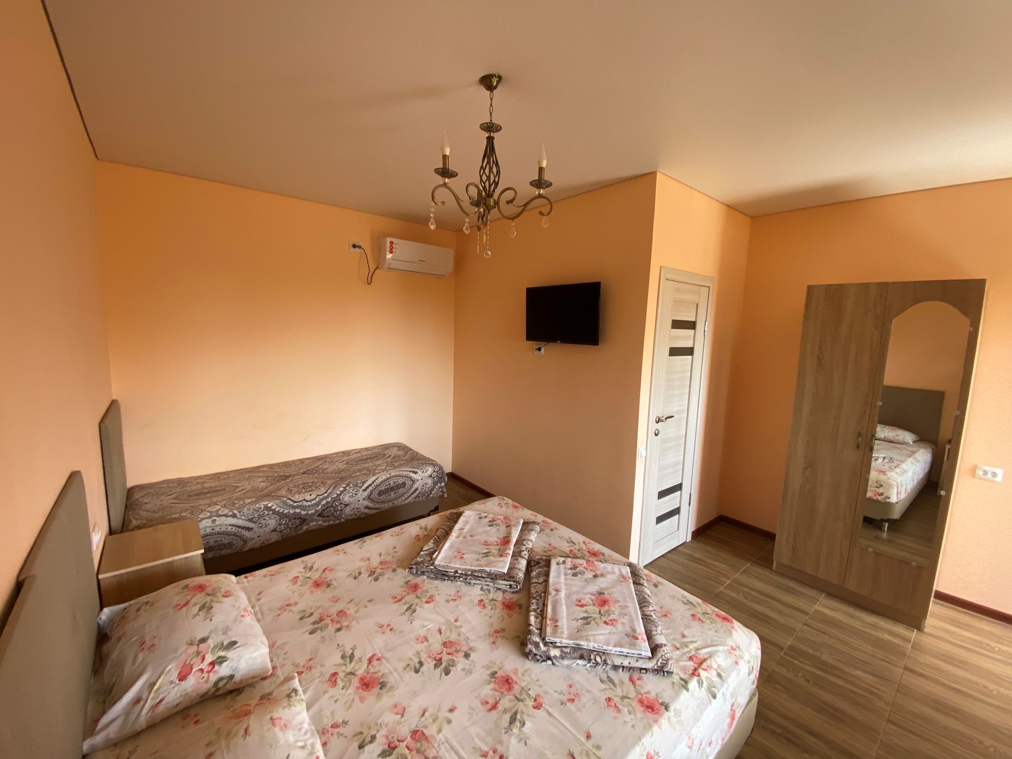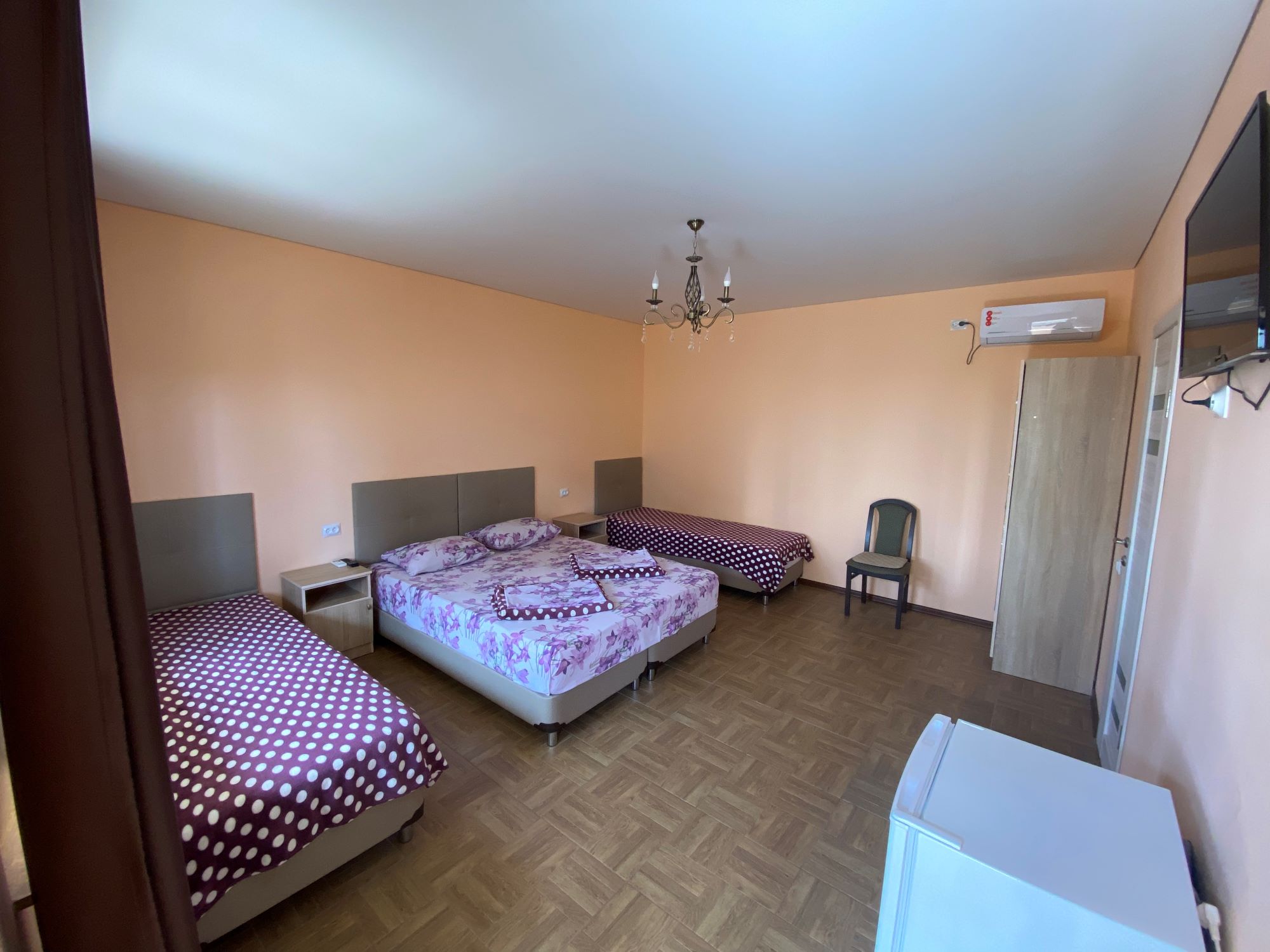 В комплектации номера спальня с двуспальной и односпальной кроватями/3 односпальные кровати, собственный санузел с душем. Из удобств - кондиционер, мини-холодильник, телевизор, Wi-Fi. Возможно размещение на дополнительном спальном месте - раскладная кровать. Напольное покрытие: плитка или ламинат.