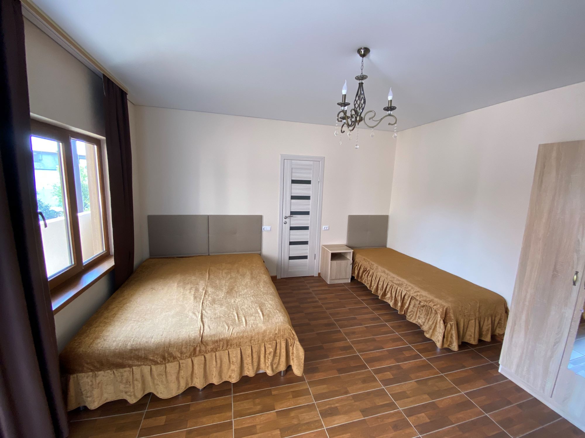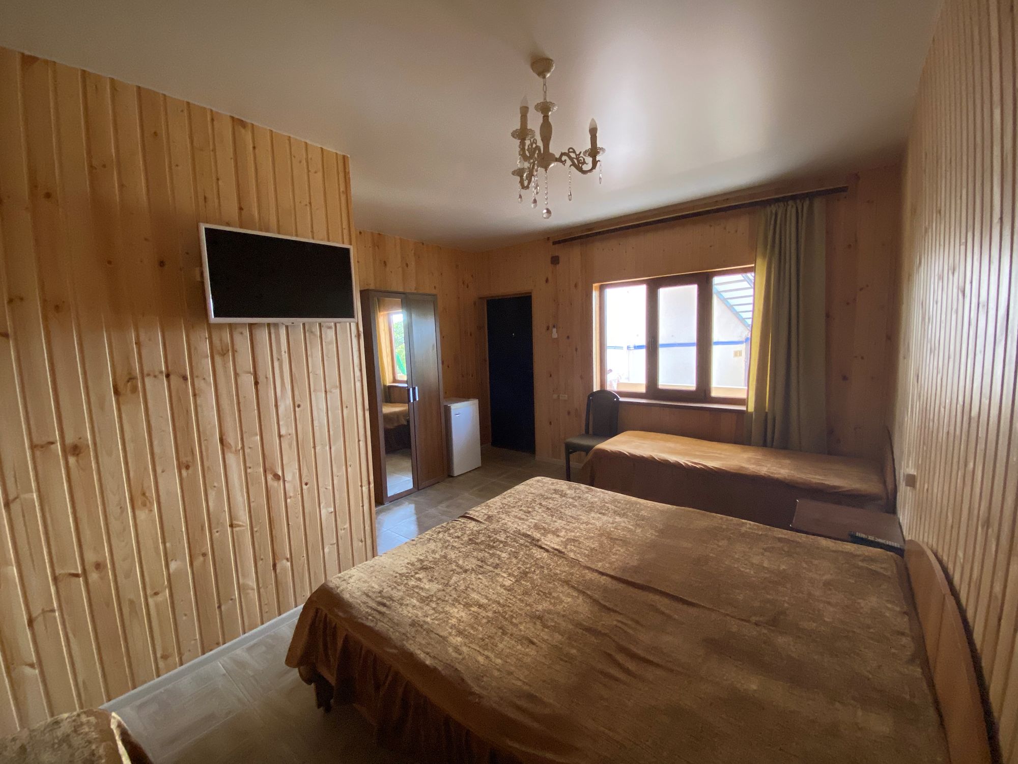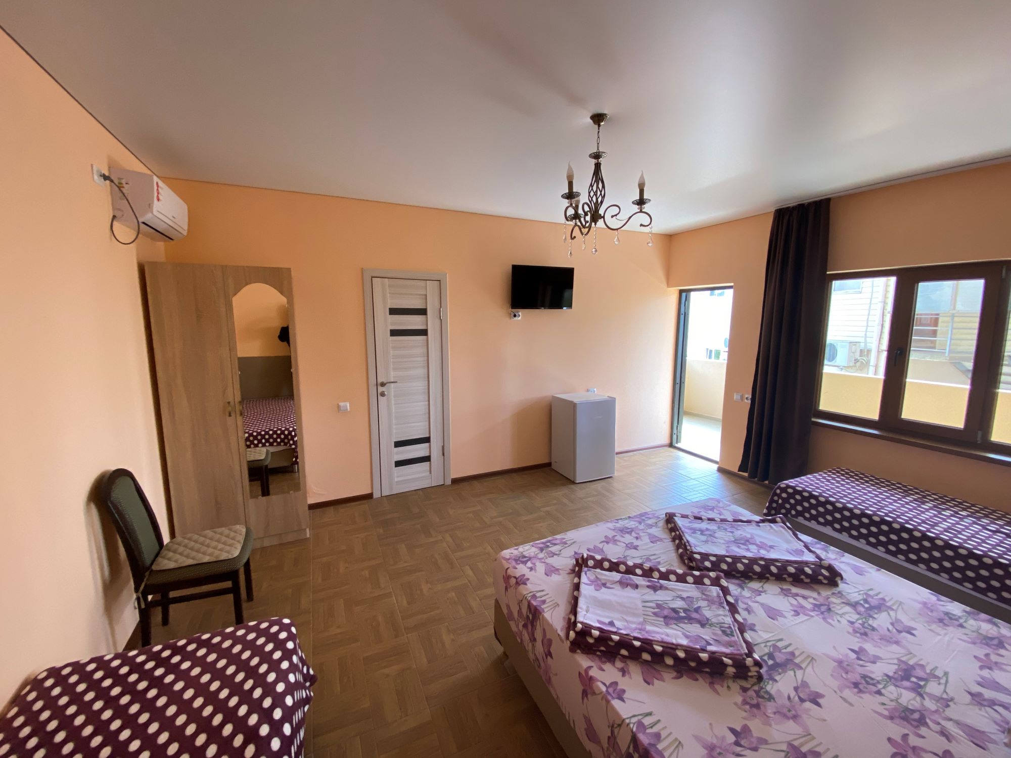 В комплектации номера спальня с двуспальной и односпальной кроватями/3 односпальные кровати, собственный санузел с душем. Из удобств - кондиционер, мини-холодильник, телевизор, Wi-Fi. Возможно размещение на дополнительном спальном месте - раскладная кровать. Напольное покрытие: плитка или ламинат.