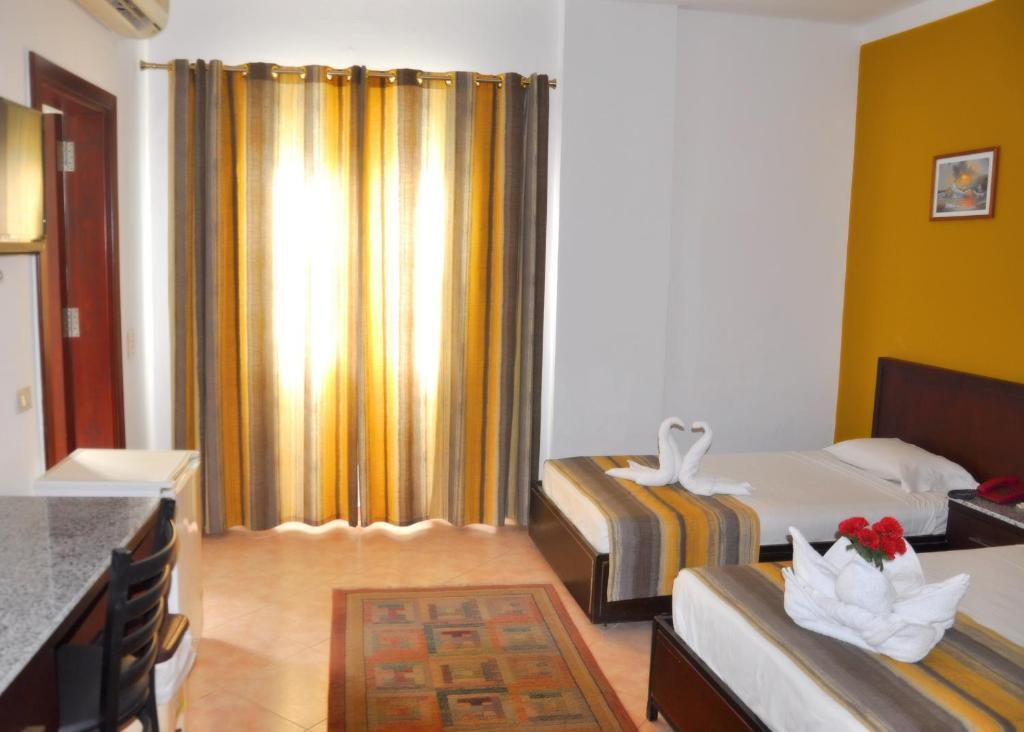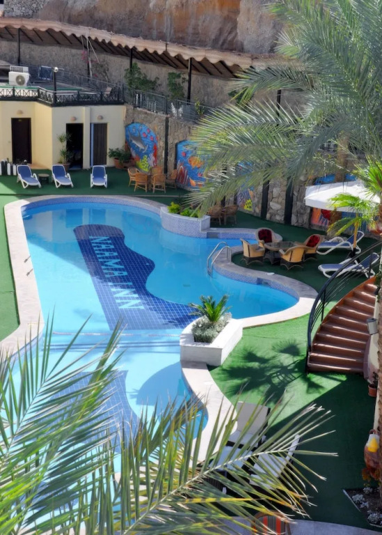Бронировали на Booking стандартный двухместный номер на 3 ночи 01.12.22-04.12.22 за 119$ с завтраком и ужином без предоплаты, оплата при заселении. Приехали в отель в 5 утра, заселили с доплатой 15$ за ранний заезд и завтрак. Номер дали на 2 этаже на террасе с видом на прогулочную улицу. Номер большой, был работающий кондиционер, чайник и телевизор. Фена нет. В ванной мыло и шампунь с гелем для душа. На террасе у входа в номер есть столики и кресла, можно посидеть, отдохнуть. Также у каждого номера сушка для одежды. Ночью, из-за непосредственной близости прогулочной улицы с кафе, шумно до 3 утра, но беруши спасают – засыпали сразу и звуки не мешали. Комары: в Naama Inn их нет. В другом отеле (Amar Sina) был кошмар, спрей не помогал, пришлось купить местный фумитокс, до этого полночи не спали. Тут с этим проблем нет. WiFi: хороший, но как и обещали, работает только в общих зонах – у бассейна. Бассейн: чистый. В зоне у бассейна всегда отдыхали туристы, т.к. там ловит WiFi и на период Чемпионата мира по футболу в Катаре вели онлайн трансляции. Питание: брали завтраки и ужины. Ужины на 5 - всегда был суп, рис, картошка, мясо, рыба, свежие овощи и десерты. Можно брать добавки, в том числе и мяса. Чай/кофе на ужин нет, но вода в кулере без ограничений. Завтраки, конечно, не такие шикарные, но тоже очень хорошие – каша, картошка, свежеприготовленный омлет, свежие и запеченные овощи, выпечка, сок, кофе и чай. Пляж: Viva (для прохода надо получать ваучер на ресепшн, дают полотенца) - пешком 5 минут. На пляже в свободном доступе лежаки, зонтики и пуфики. Вход в воду песчаный, специальная обувь не нужна. На соседнем пляже справа есть понтон – там очень много рыб, в том числе крылатка, очень красиво. Да и в целом по берегу можно свободно прогуляться по всей бухте. Расположение: отличное! На пляж можно пойти в любое время, не привязан к трансферам, как в других отелях. В паре минут супермаркет FIX PRICE MARKET с русскоговорящим персоналом, цены практически такие же, как в других отдаленных супермаркетах. Слева от входа в Naama Bay Hotel банкомат, в котором можно обменять наличную валюту на наличные египетские фунты. На главной дороге каждые полминуты останавливаются городские маршрутки за 5 фунтов (12,5 рублей) – можно напрямую доехать до Сохо или Старого города. Просто говорите куда Вам надо и даете деньги без сдачи, не спрашиваю стоимость проезда. Так можно бюджетно доехать до аэропорта – на маршрутке за 5 фунтов доезжаете до Peace Square (10 минут), а там 4 км до аэропорта можете доехать на такси за 40 фунтов (3 минуты) – итого на двоих дорога до аэропорта 50 фунтов вместо 250 фунтов на такси от отеля и по времени это займет полчаса.