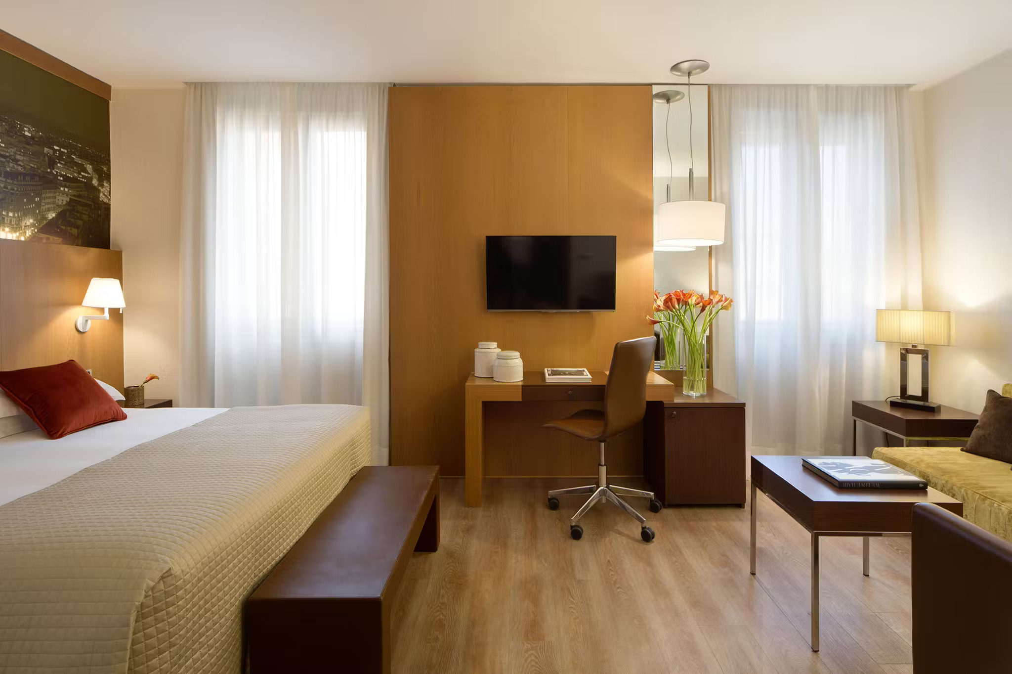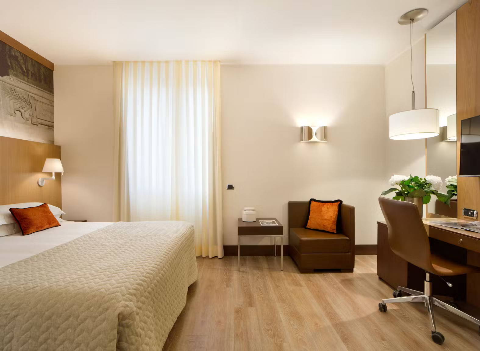 Мы выбрали Starhotels Ritz в центре Милана, ожидая истинных 4 - звездный опыт. К сожалению, мы были очень разочарованы. Мы заказали номер повышенной комфортности для двух человек, но мое первое впечатление было недоверием — он был настолько мал, что я думал, смогу ли я вообще поместиться наедине со своим чемоданом. Места для комфортного передвижения двух человек просто не нашлось. Номер больше походил на дешевое общежитие, чем на гостиничный номер повышенной комфортности. В целом, это пребывание было большим разочарованием, и отель не соответствовал стандартам, которые мы ожидали от свойства 4 - звезды.